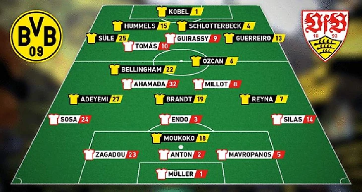 Главный тренер дортмундской «Боруссии» Эдин Терзич не стал мудрить и принял решение играть по схеме 4–2–3–1, в которой, из-за отсутствия Менье и из-за неготового играть полный матч Вольфа, Зюле занял позицию правого защитника, а Беллингем действовал гораздо агрессивнее и ближе к атаке, чем его напарник по опорной зоне Озджан. Единственный нападающий Мукоко часто возвращался в полузащиту и предлагал себя в качестве еще одного адресата для передачи: Грегор Кобель, Рафаэль Геррейро, Нико Шлоттербек, Матс Хуммельс, Никлас Зюле, Салих Озджан, Джуд Беллингем, Юлиан Брандт, Джованни Рейна, Карим Адейеми и Юссуфа Мукоко.
