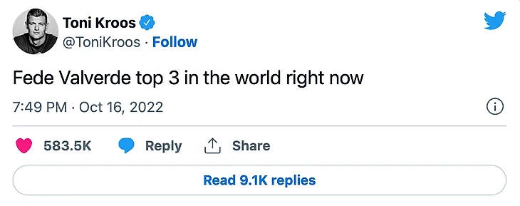 Неделю назад Тони Кроос заявил, что Вальверде – в тройке лучших игроков мира прямо сейчас. Мы более чем согласны с Тони, поэтому поставили его на второе место – Феде полностью этого заслуживает.