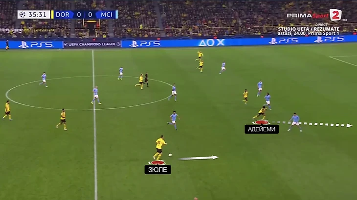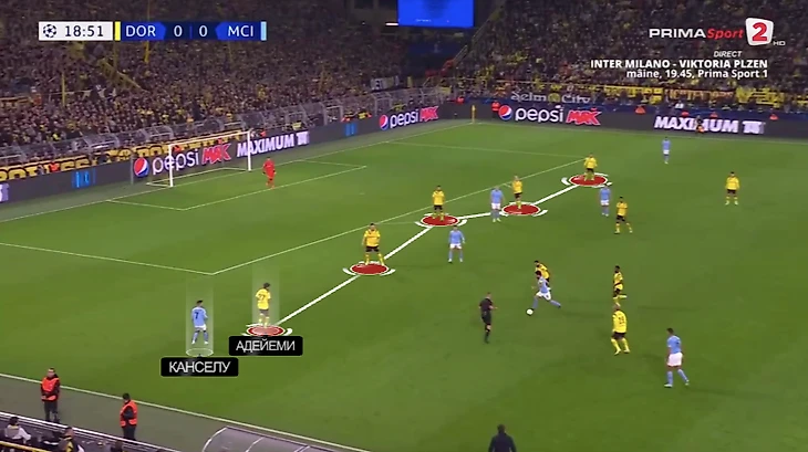 Терзич здорово подстроился и ответил. Опускания полузащитников больше не требовались, зато дополнительную работу без мяча получил Карим Адейеми. Именно ему приходилось опускаться за Канселу и создавать ситуативную пятерку: