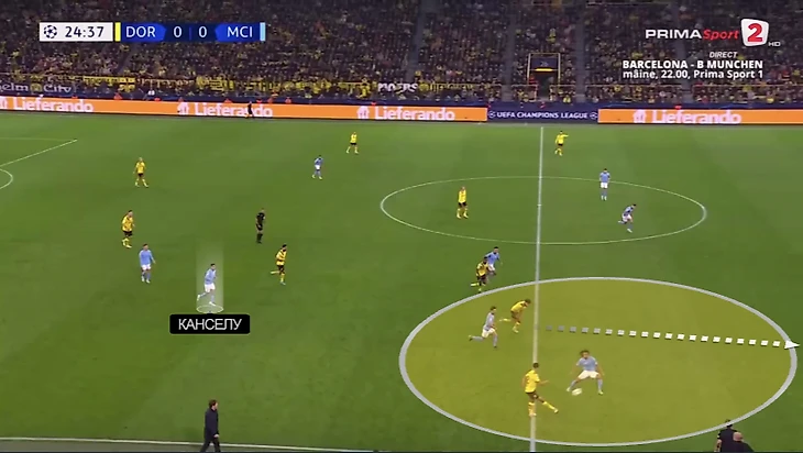 На вчерашний матч Пеп слегка видоизменил структуру владения. КДБ остался в запасе (и так и не вышел), Гюндоган первый тайм провел в опорной зоне. В итоге пятерку в атакующей линии образовывал Жоау Канселу.