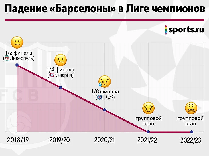 • «Барселона» движется по нисходящей: полуфинал ЛЧ-2019 (с теми самыми 0:4 на «Энфилде»), четвертьфинал и 2:8 от «Баварии» в ковидный сезон, вылет от «ПСЖ» в 1/8 финала сезона-20/21 и теперь два подряд непопадания в плей-офф.