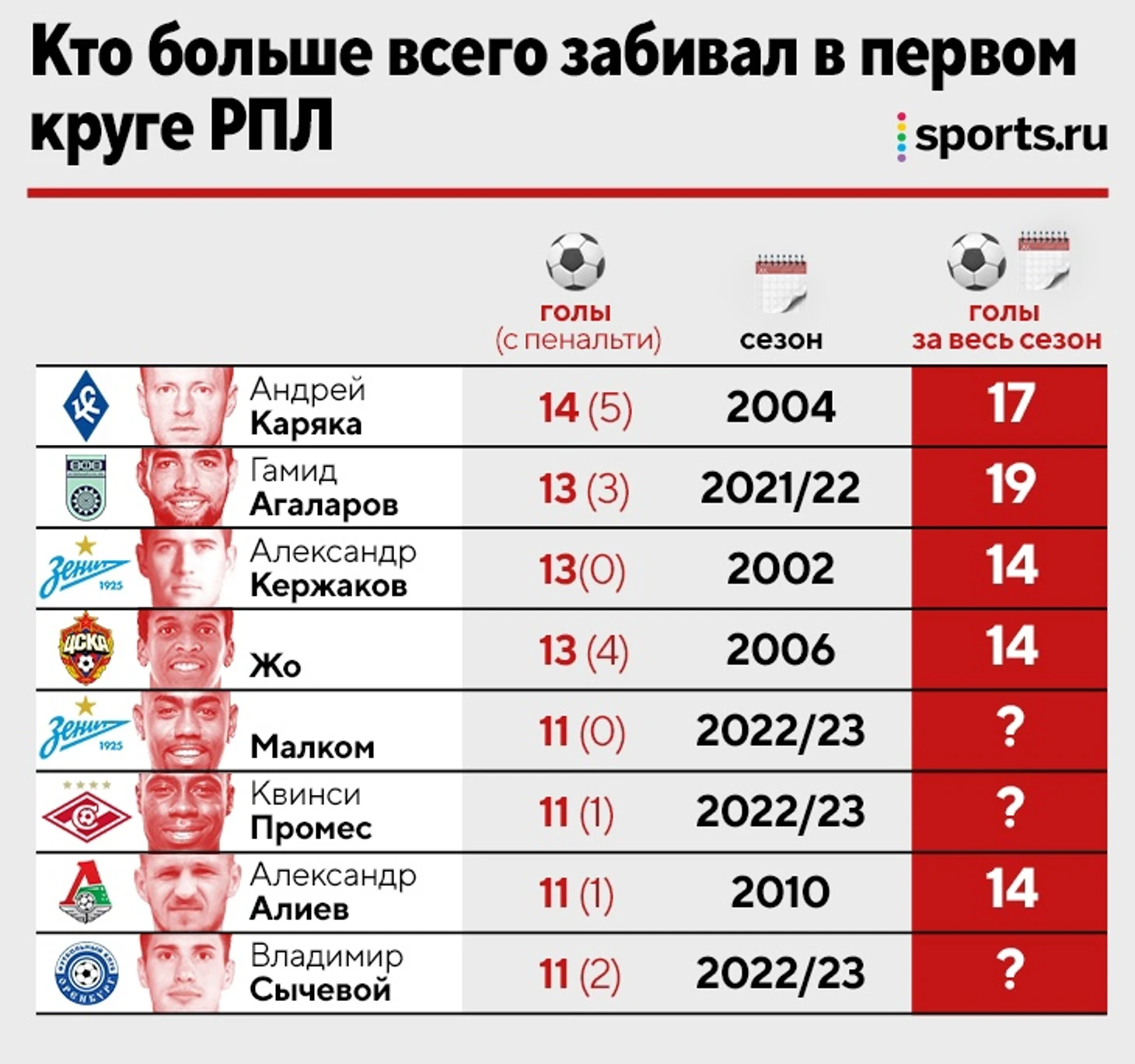Интересно, что лишь в пяти случаях лучший бомбардир первого круга становился самым результативным игроком всего сезона. Это Веллитон-2009 (в первом круге столько же забил Александр Кержаков), Халк-2014/15 (в первом круге столько же забил Бибрас Натхо), Федор Смолов-2016/17, Артем Дзюба-2020/21 (в первом круге столько же забил Кристиан Нобоа) и Гамид Агаларов-2021/22.