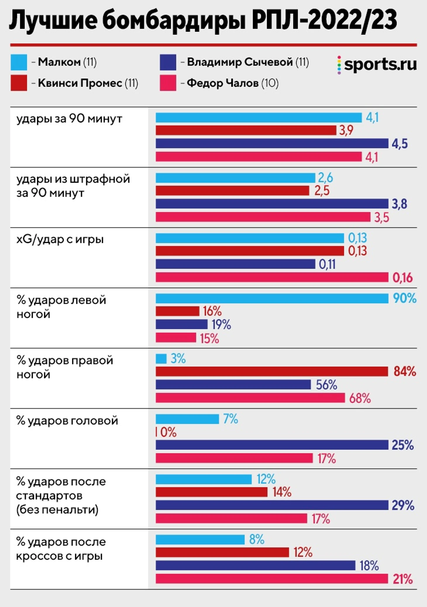 Малком все голы забил с игры, поэтому занимает первое место в гонке. Сычевой отыграл меньше конкурентов, но больше забил с пенальти – поэтому третий.