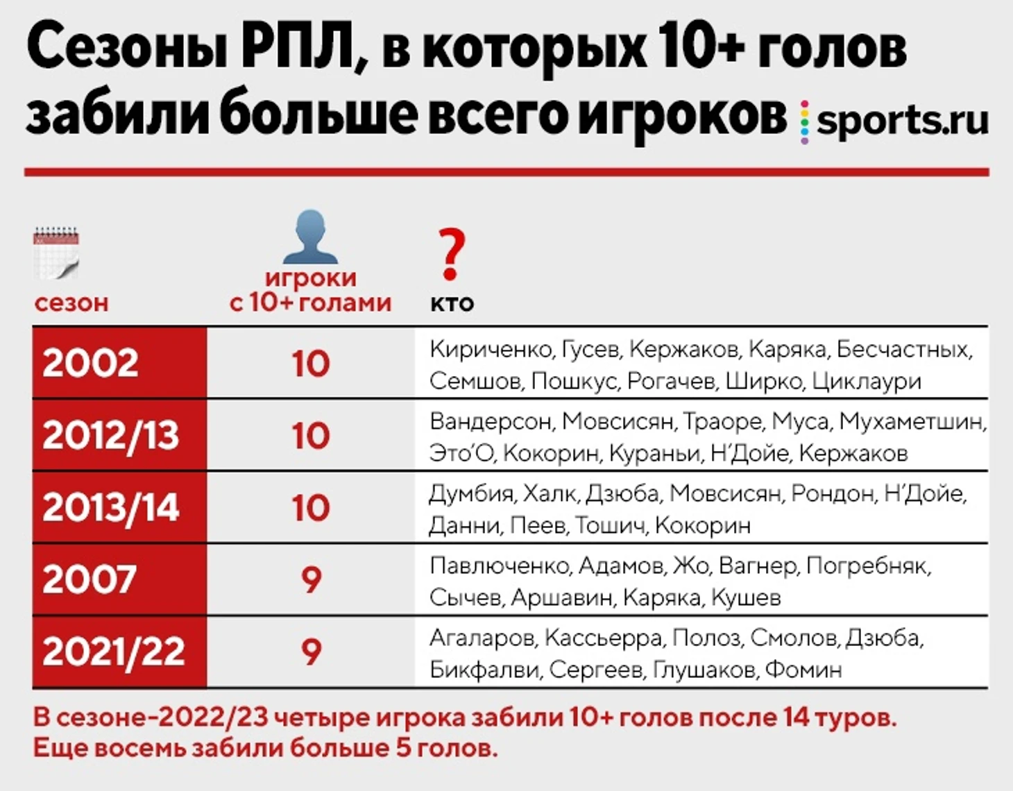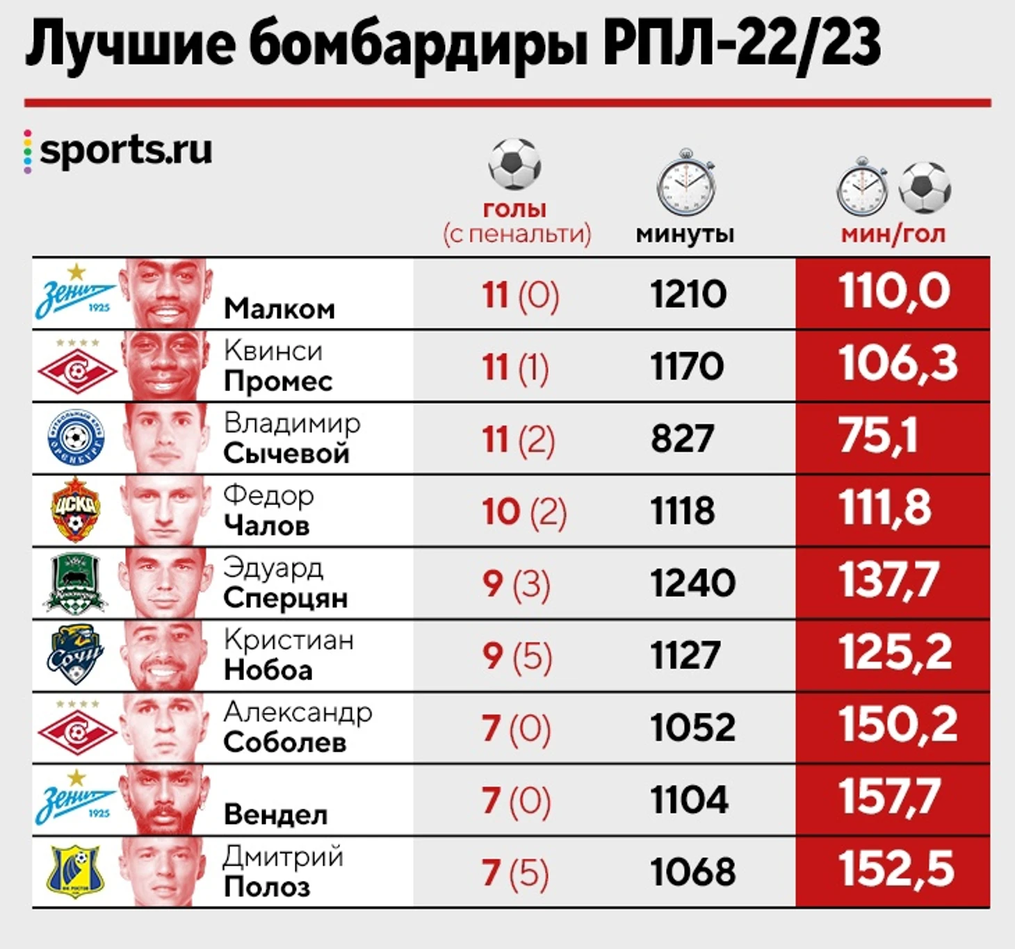 В этом сезоне минимум десятка – уже у четвертых. В топе идеальный состав: две главные звезды лиги (Малком и Промес), вернувшийся на топ-уровень российский нападающий (Федор Чалов), а также открытие сезона (Владимир Сычевой, который в прошлом году забил всего шесть мячей в Первой лиге).