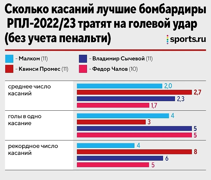 Малком забил три гола после добиваний, но среди главных бомбардиров лиги меньше всего касаний для гола нужно Чалову. Обычно Федору достаточно одного-двух, исключение – только матч с «Факелом», когда Чалов получил мяч на левом краю штрафной и довольно долго подрабатывал под удар (в итоге – пять касаний).
