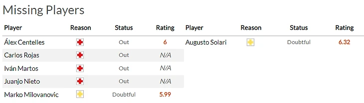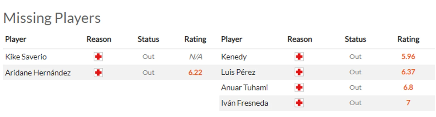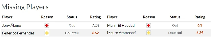 У гостей впрочем, также есть кадровые потери. Причем долгоиграющего характера. До следующего года не выйдет на поле Марио Арамбарри(6,5), а на этой неделе лег на операцию Фабрисио Анхилери(5,5), который также не появится до самого перерыва на ЧМ.