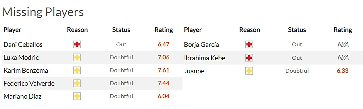 Из хороших новостей для Королевского клуба есть возвращение в строй Вальверде(7) и Луки Модрича(7,5), а также то, что они вместе с Каримом Бенземой(10) приняли участие в сегодняшней тренировке мадридцев и работали на газоне. Впрочем не ясно сколько и как именно.