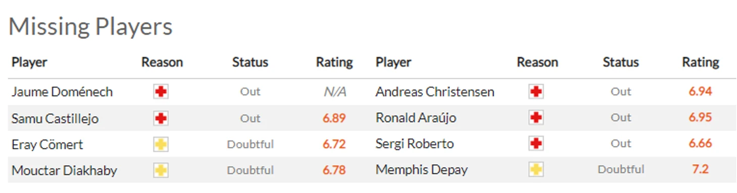 А вот самой Валенсии придется поднапрячься. Мало того, что Барса приедет на Месталью сильно раздраженной после поражения в ЛЧ, так ещё и в ростере мышек нарисовались проблемы. Диакаби(5,5) и Мориба(6,5) пропускают матч из-за травм, а Муса(6) - из-за перебора карточек.
