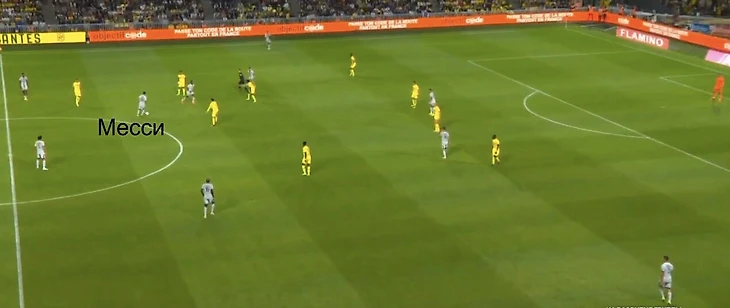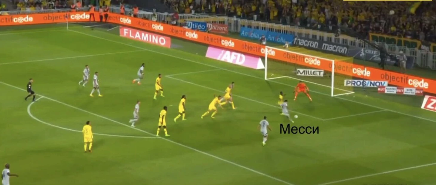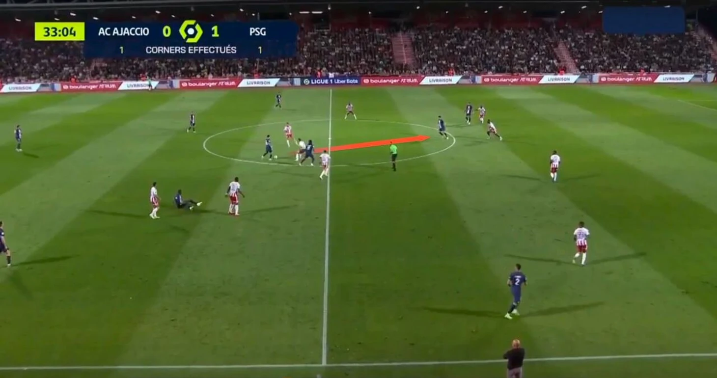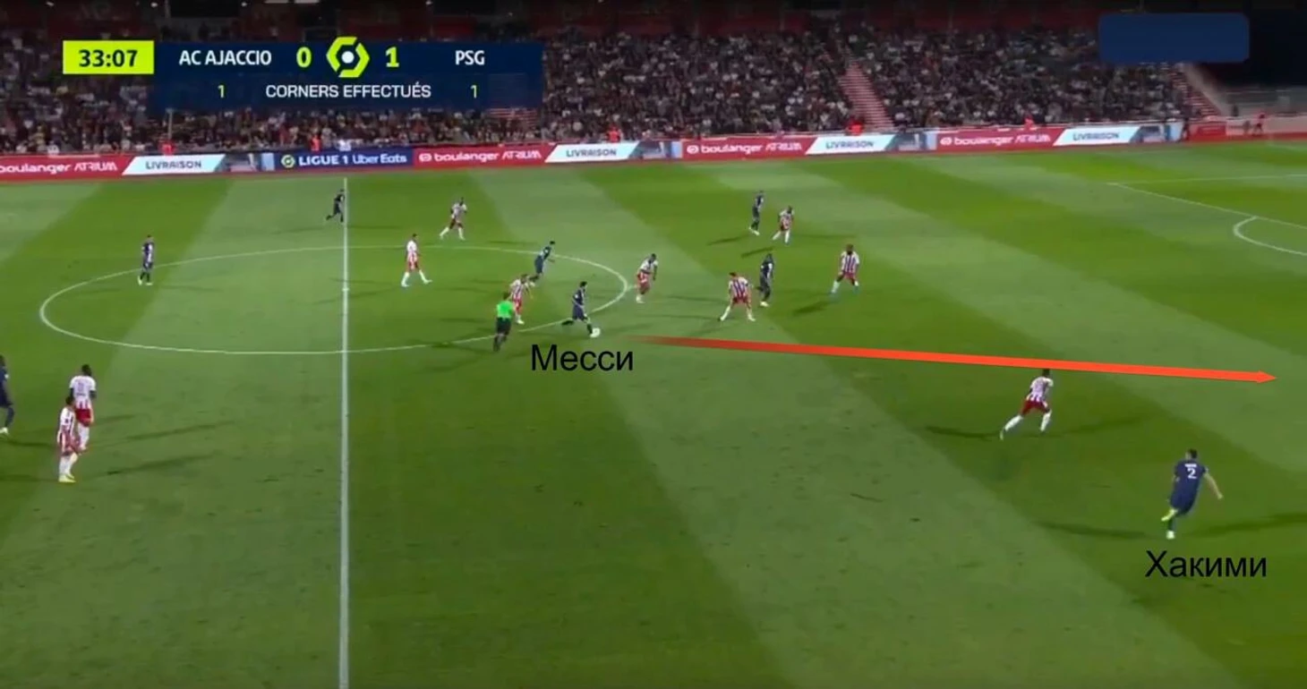 Вот пример из матча с «Аяччо», где Месси сначала продвигает мяч в атаку, а затем обостряет пасом на ускоряющегося Хакими.