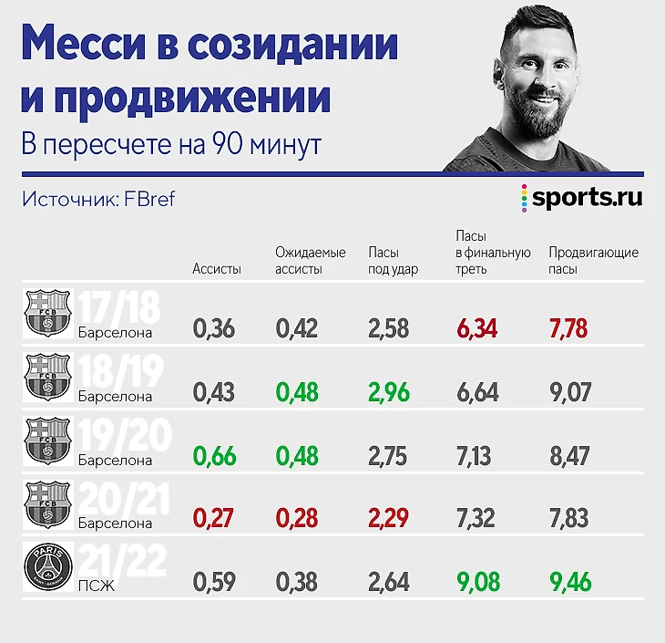 В пересчете на 90 минут Месси в «ПСЖ»-2021/22 забивал лишь 0,25 мяча за игру – его худшим результатом за карьеру были 0,46 гола в сезоне-2007/08. В следующих 13 сезонах за «Барсу» он ни разу не спустился ниже 0,78 (2019/20), в восьми случаях пробивал отметку в гол каждые 90 минут.