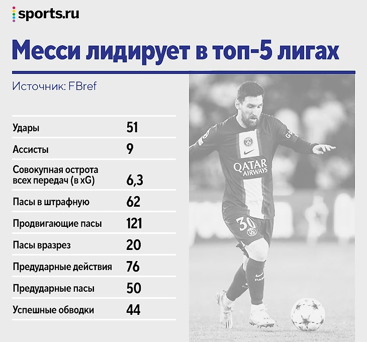 Это работает. Ниже – список статистических показателей, где Лионель Месси занимает первое место в Европе. Не в «ПСЖ», не в Лиге 1, а во всех лигах топ-5.