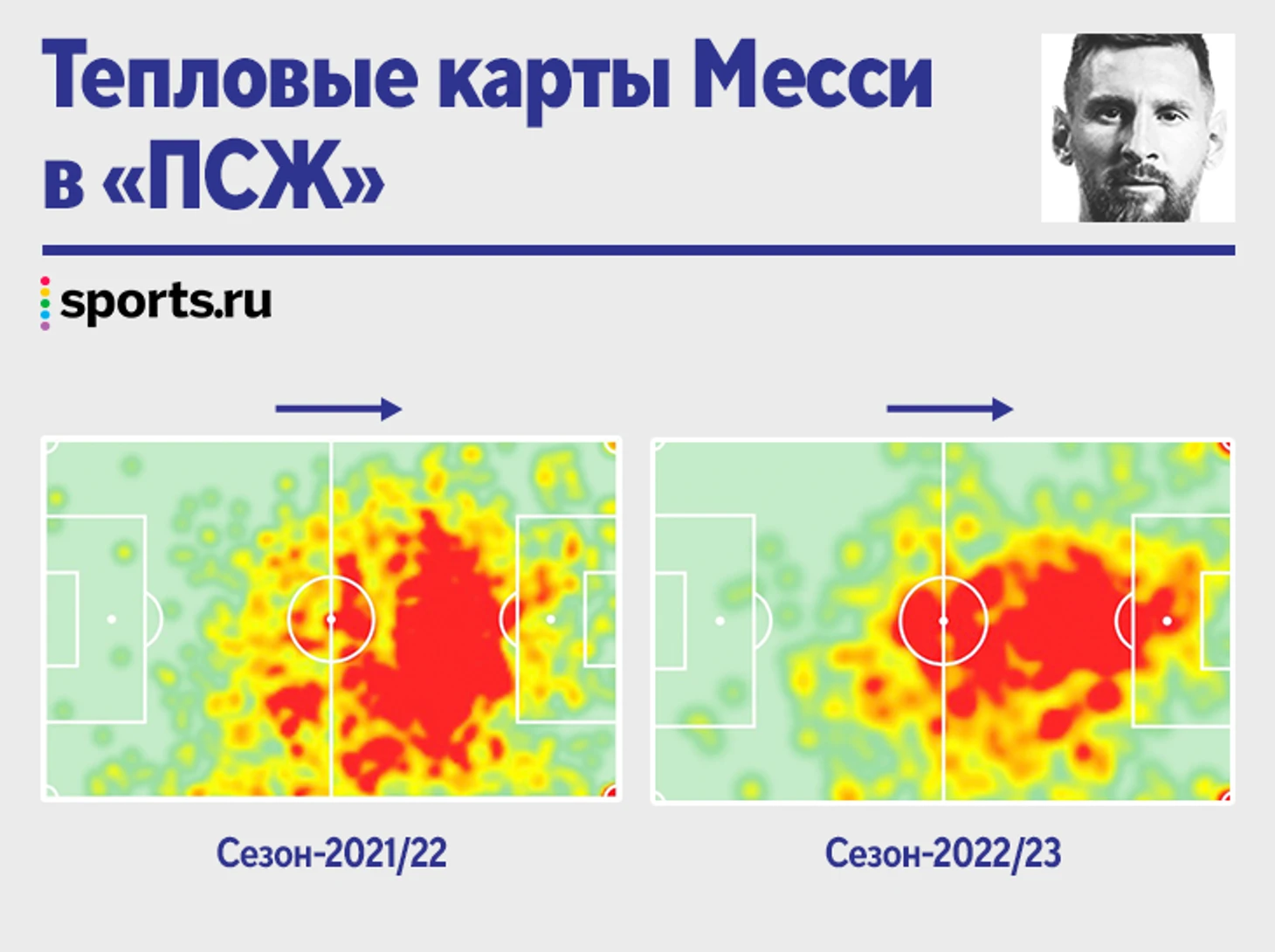 Ниже – тепловые карты действий Месси в сезоне-2021/22 и 2022/23. Обратите внимание на красные зоны в штрафной соперника и в центральном полукруге на своей половине поля – этого не было раньше.