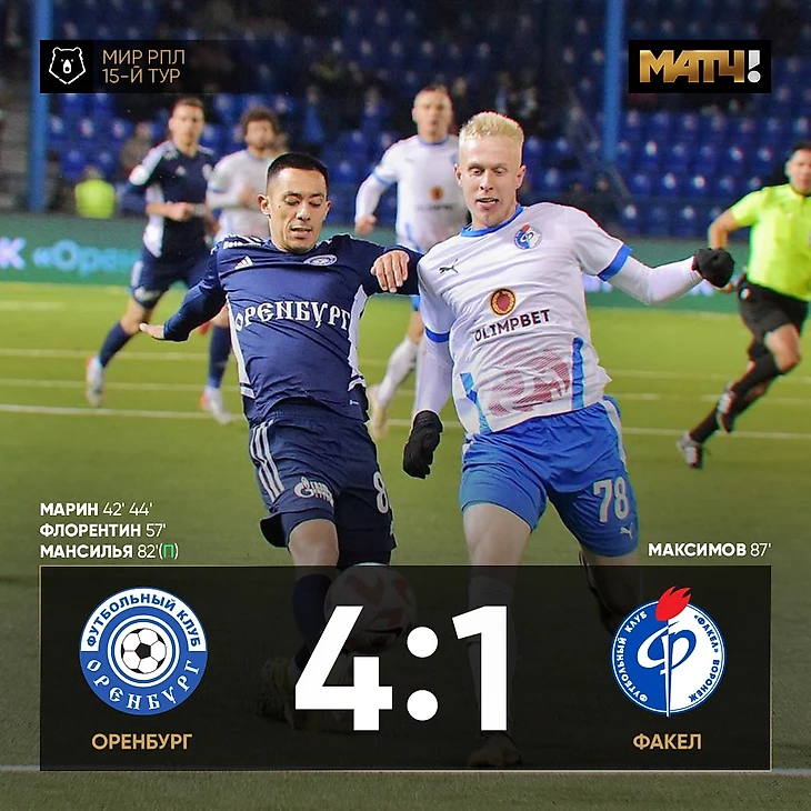 📃Итог матча 4:1 Оренбург одерживает уверенную победу и опускает Факел на 13-ю позицию в РПЛ.
