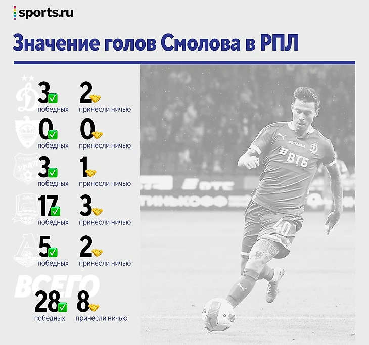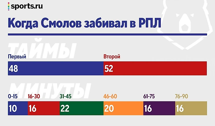 По таймам разницы практически нет. Главный вывод по времени – Смолов не очень бодро начинает матчи.