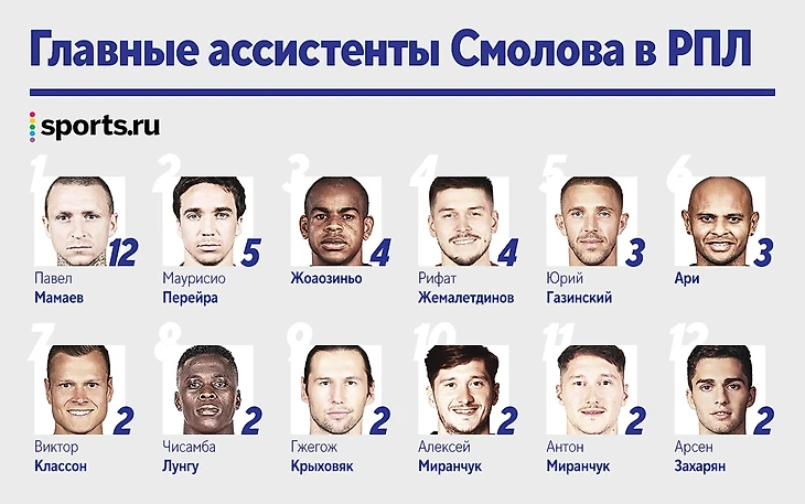 Павел Мамаев – главный ассистент в карьере Смолова. В сезоне-2015/16 Федор забил 9 голов с передач Павла. Ни одна связка не забивала больше в новейшей истории РПЛ (статистика ведется с сезона-2013/14).