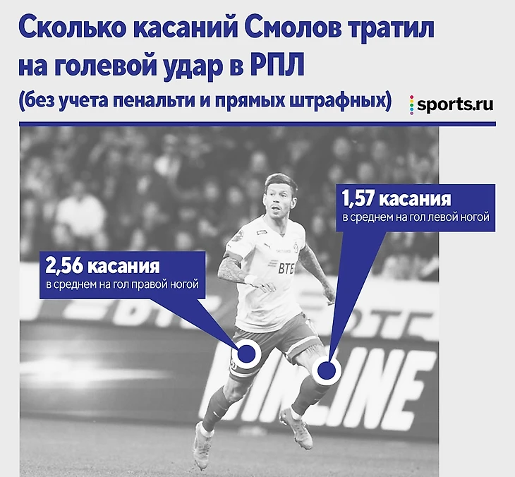 На голевой удар с левой ноги Смолов в среднем тратит на одно касание меньше. Голы после долгого дриблинга, раскачивания соперника и удара в дальний гол – в основном с правой.