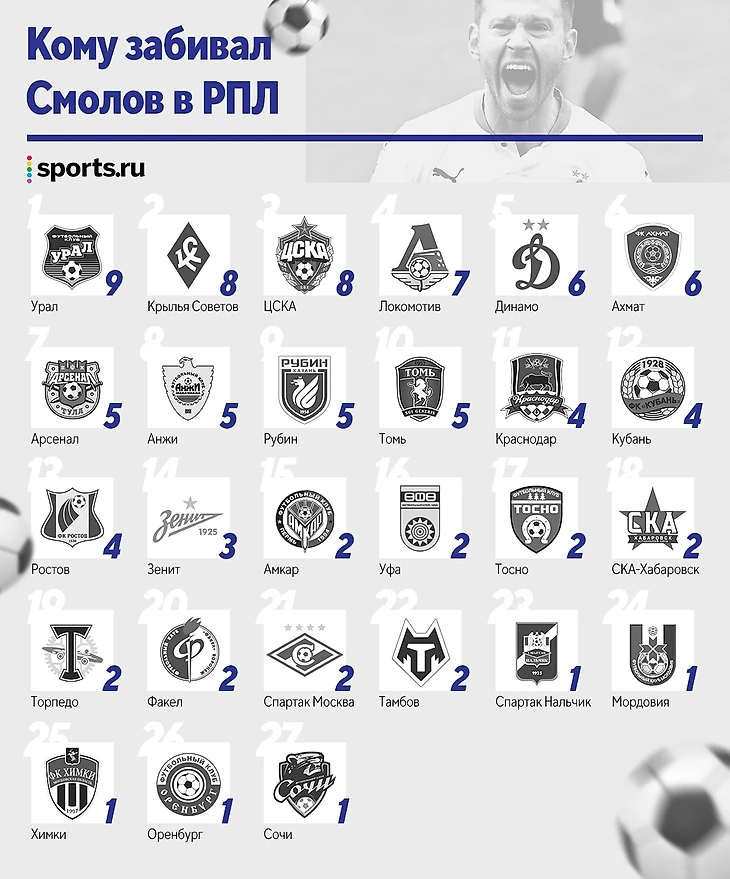 Все о 100 голах Смолова в РПЛ: чаще всего забивал Акинфееву, больше всего – в «Краснодаре», главный ассистент – Мамаев