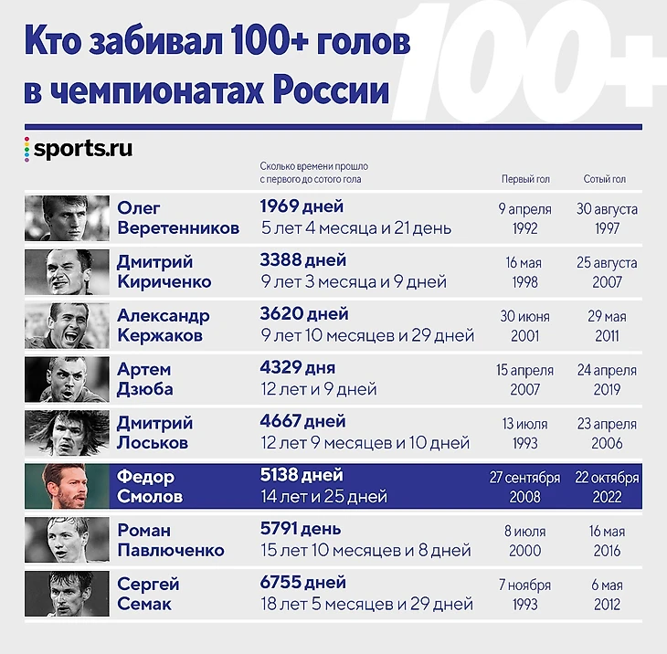 С момента дебюта в РПЛ в 2008-м Федор провел вне лиги год – по полсезона в «Фейеноорде» (сезон-2010/11) и «Сельте» (сезон-2019/20). Даже с учетом этого, 14 лет – все равно много. Главные паузы была в начале карьеры: первый и второй голы разделили почти два года, третий и четвертый – почти три.
