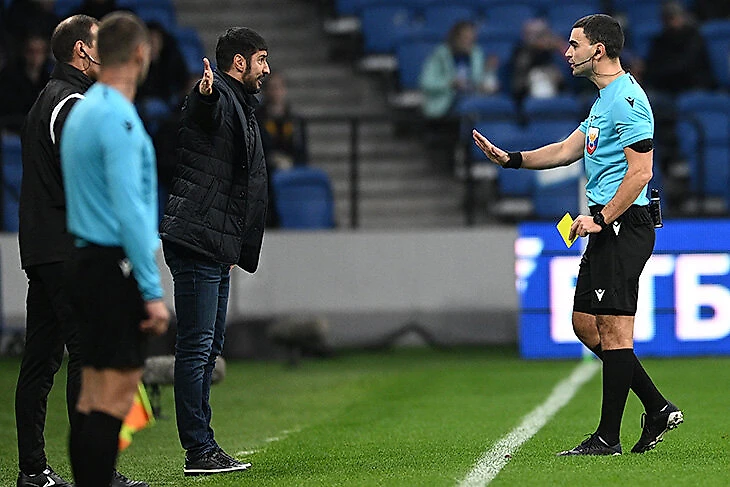 Через несколько минут «Химки» получили первую желтую в игре – ею отметился не игрок, а главный тренер Спартак Гогниев, который слишком эмоционально поспорил с арбитром Яном Бобровским.