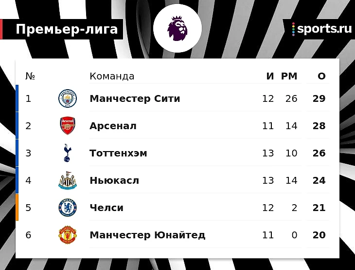 • После поражения «Челси» остался на пятой строчке, но его главные конкуренты в таблице – «Ньюкасл» и «Тоттенхэм» – ушли в отрыв благодаря победам над «Астон Виллой» (4:0) и «Борнмутом» (3:2, «Тоттенхэм» вырвал победу на 92-й минуте). Топ-6 замыкает «МЮ», который подобрался к «Челси» на расстояние одного очка, при этом имея игру в запасе.