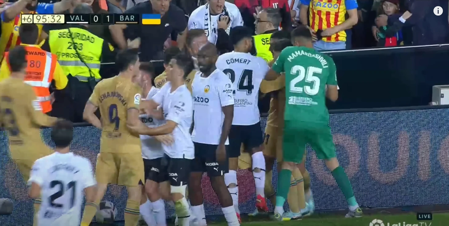 А уже в конце матча состоялась эпичная массовая потасовка между игроками обеих команд, которая началась с грубости защитника «Валенсии» против Левандовского.