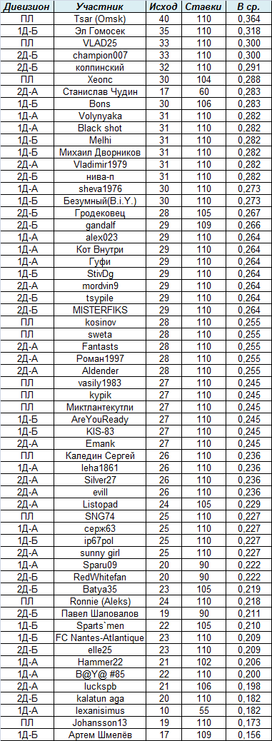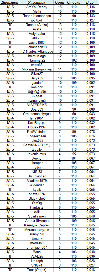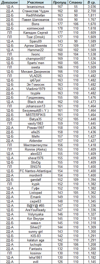 Что интересно - первая тройка состоит из сплошь не только лидеров по особому настрою или нелюбви, которым мстят за прошлые осечки. Первая тройка - это еще и абсолютные лидеры по пропускам туров. Получаются, те, кто против них играл, раскрепощался и выпускал на свободу свое геройство и бомбардирское чутье.