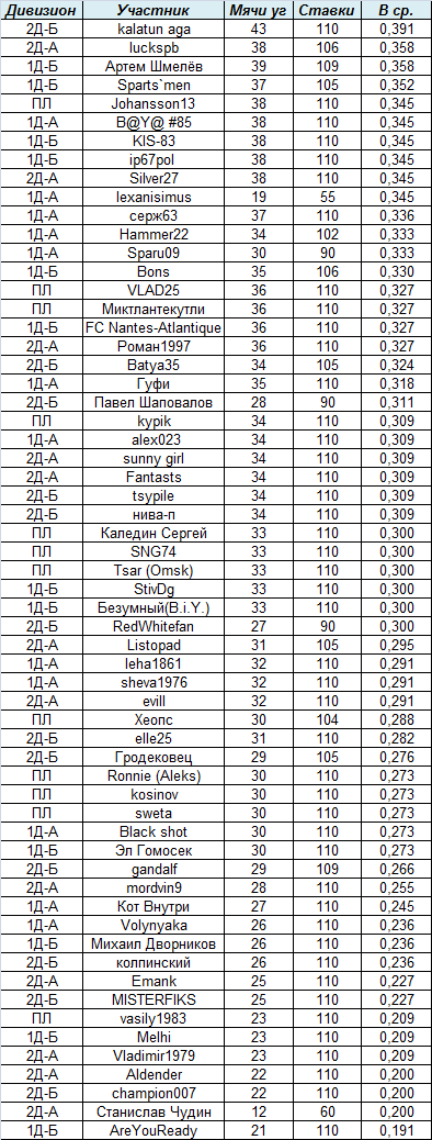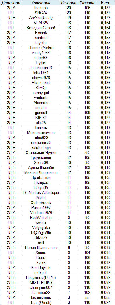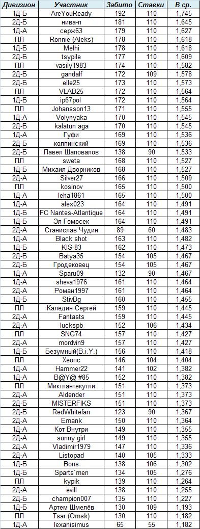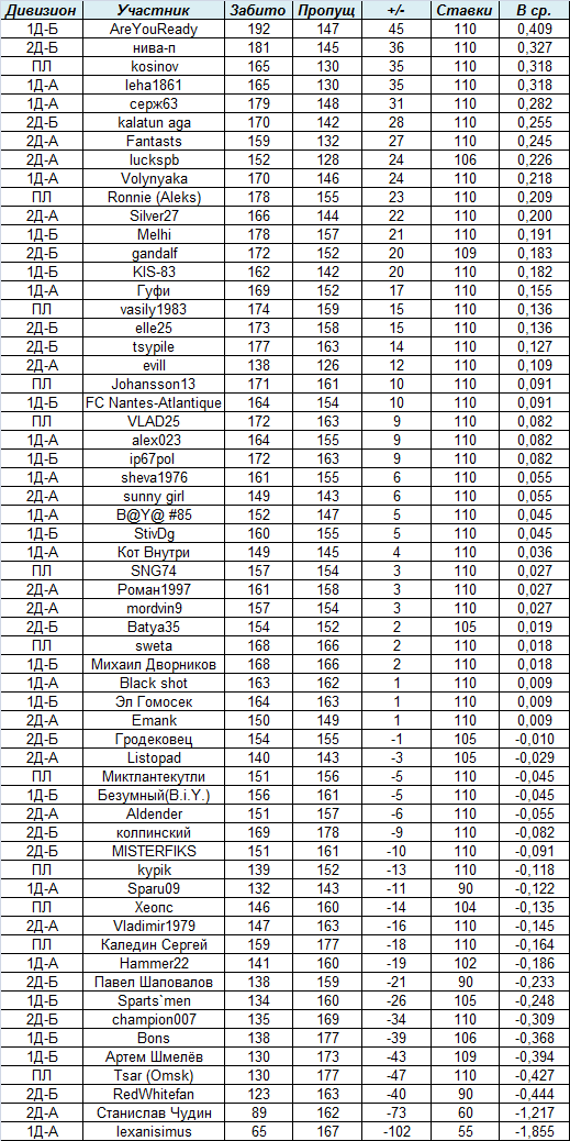 Из совокупности забитых и пропущенных голов, приходящихся на одну ставку, можно также получить целую картину оценки сил участников: