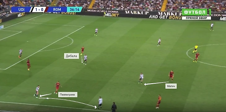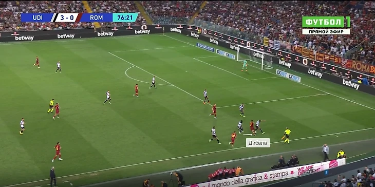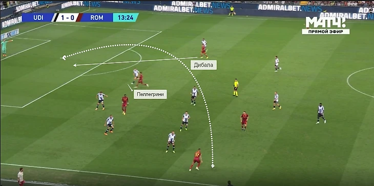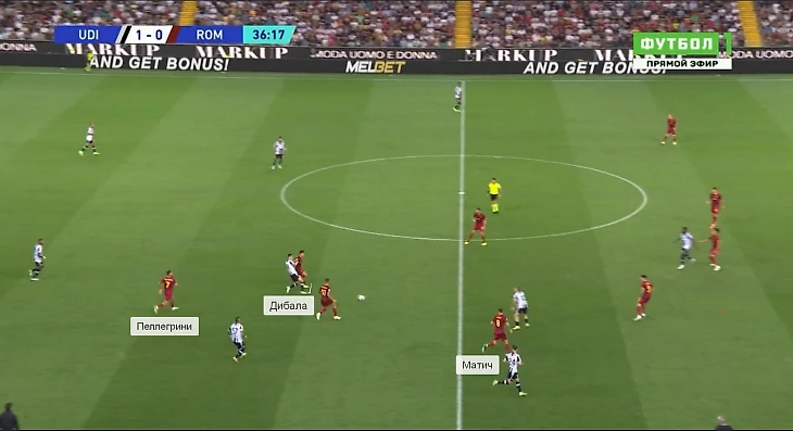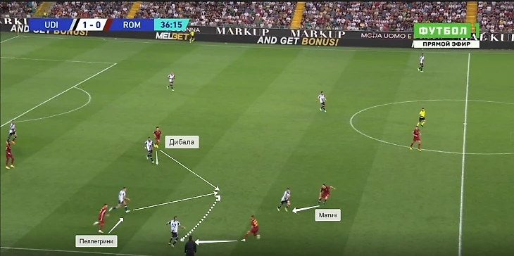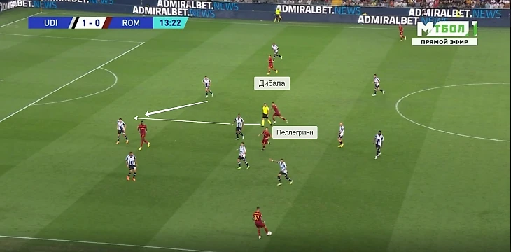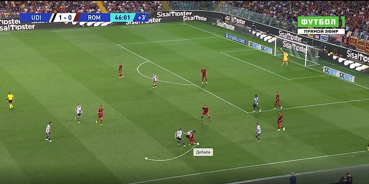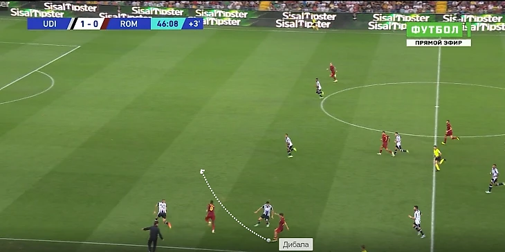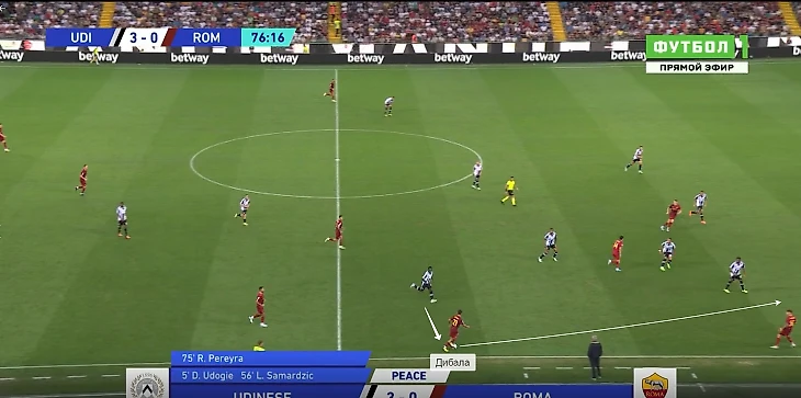 Специально под «Удинезе» «Рома» в обороне перестроилась на схему 5-3-2. Пауло играл персонально по опорнику Уоласу. Если Дибала встречал защитника, то старался одновременно перекрывать направление передачи на бразильца.