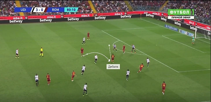 Когда мяч у него, «Рома» разнообразно продвигает владение ближе к штрафной. Защитники не могут уходить за ним так высоко (рушится структура), поэтому Дибала остается один и успевает подумать после приема.