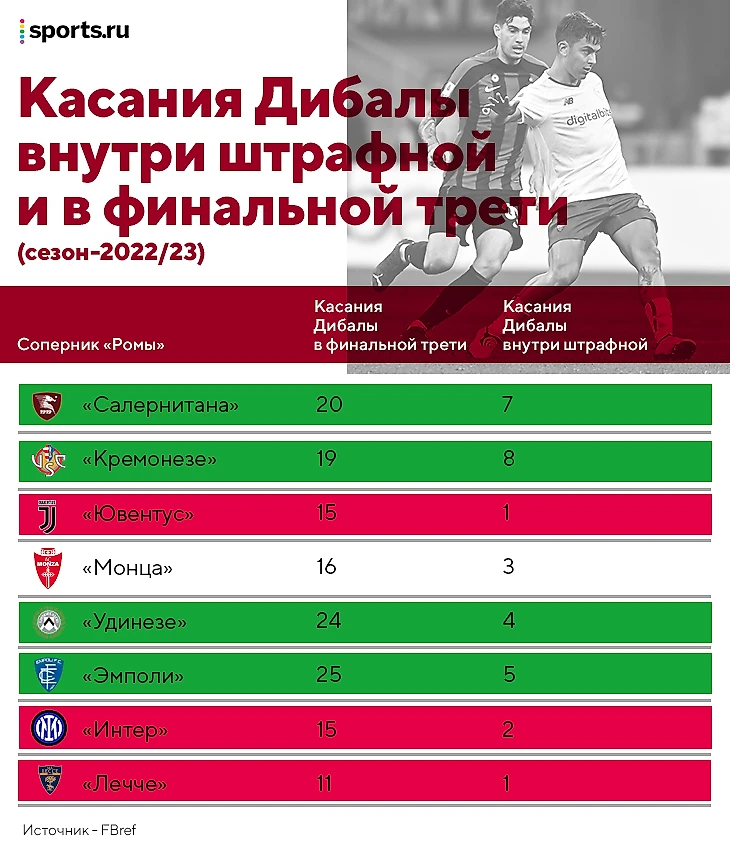 Пока рано выделять тенденции, но во всех матчах, когда Дибала был незаметен (против «Ювентуса», «Интера» и «Лечче»), он делал меньше всего касаний в финальной трети и внутри штрафной.