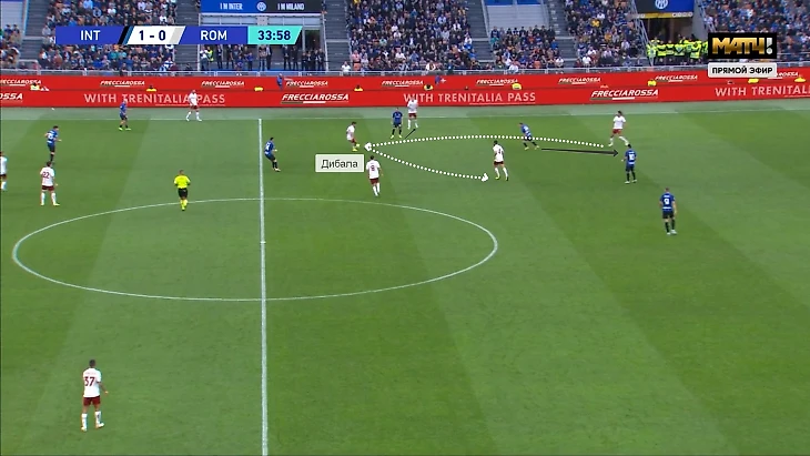 Пример из матча с «Интером». Дибала опустился к Манчини и Смоллингу. Чалханоглу и Барелла накрывали их 1-в-1, но аргентинец открылся без давления (Аслани изначально опекал Дзаньоло и не успел накрыть) и в касание отдал Кристанте.