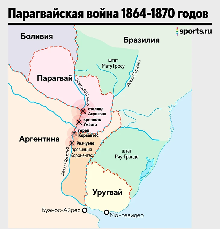 В конце 1864 года она перешла в наступление на севере, начав поход в бразильский штат Мату-Гросу. Это была глухая малонаселенная окраина Бразильской империи. Российским футбольным болельщикам штат знаком благодаря ЧМ-2014 – в его столице Куябе сборная России сыграла вничью 1:1 с Южной Кореей.