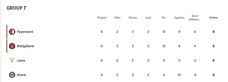 Завершился матч 6-го тура Лиги Европы УЕФА, где Римский "Лацио" уступил в гостях "Фейеноорду" со счетом 0-1. Единственный мяч забил Сантьяго Хименес на 64 минуте после ошибки Ивана Проведеля. Таким образом в самой запутанной группе F в плей-офф Лиги Европы выходят "Фейеноорд" и "Мидтьюлланд", "Лацио" проходит в Лигу конференций а "Штурм" вылетает, и все это при том, что у всех команд в этой группе по 8 очков, все решили дополнительные показатели такие как, разница забитых и пропущенных голов.