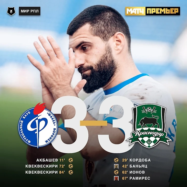 В Воронеже как всегда жарко! Ух, завидуешь болельщикам, которые посетили данный шедевр. В последнее время матч без яркой вывески может дать больше эмоций, чем топовое противостояние. Здесь было все, как положено. Много голов, два пенальти (один отбитый вратарем), привоз Сафонова в начале, но после спасения за гранью невероятного и напоследок ДВЕ ПУШКИ СТРАШНЫЕ от Квеквескири. Если пропустили обзор, то потратьте немного времени, оно того стоит.