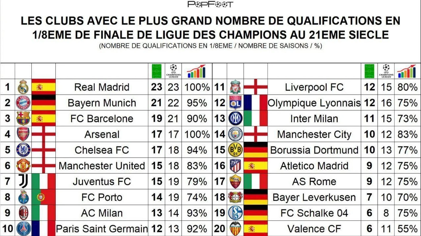 📊 | Клубы с наибольшим количеством выходов в 1/8 финала Лиги Чемпионов в 21 веке