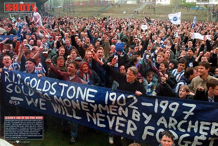 Последний домашний матч против «Йорка», который должен был стать последним и в истории «Голдстоун Граунд», не был доигран – болельщики выбежали на поле, сломали ворота и долго скандировали оскорбления в адрес владельцев. Полиция не торопилась пресекать беспорядки – полицейские сами были из Брайтона и разделяли возмущение фанатов.