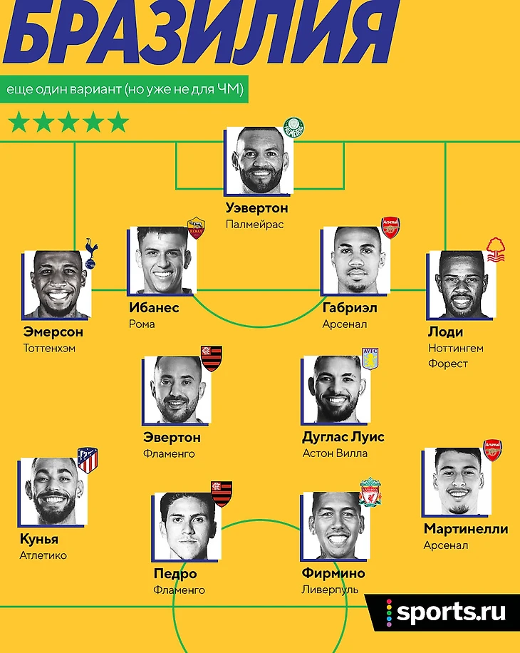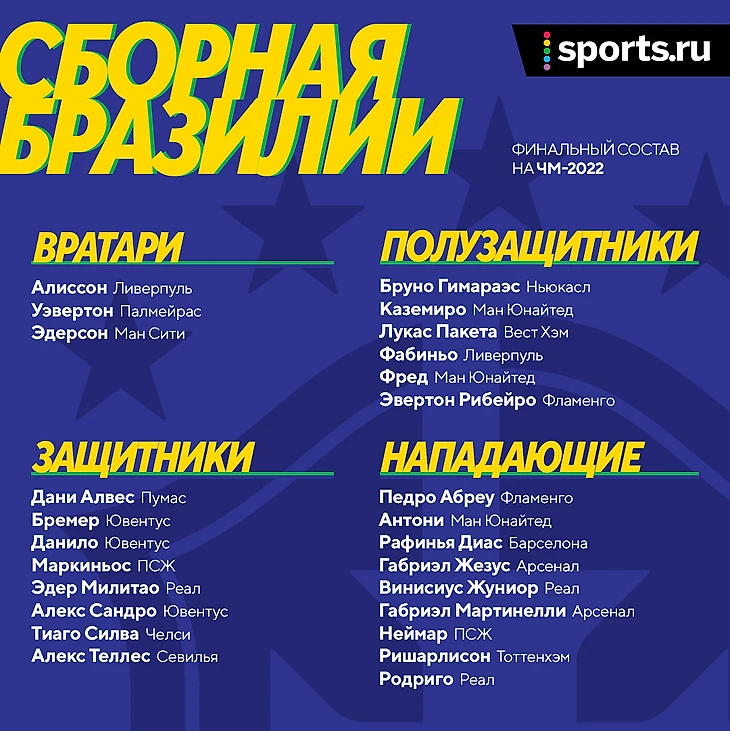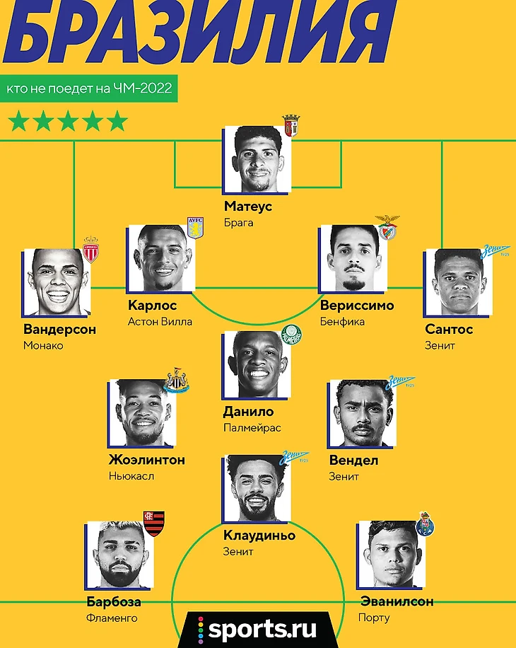 • В финальную заявку Бразилии не попали Эмерсон, Рожер Ибанес, Габриэл Магальяэс, Ренан Лоди, Дуглас Луис, Матеус Кунья и Роберто Фирмино. Особенно грустно за Бобби: после слабого сезона-2021/22 форвард «Ливерпуля» расцвел в этом (8+4 в 19 матчах).