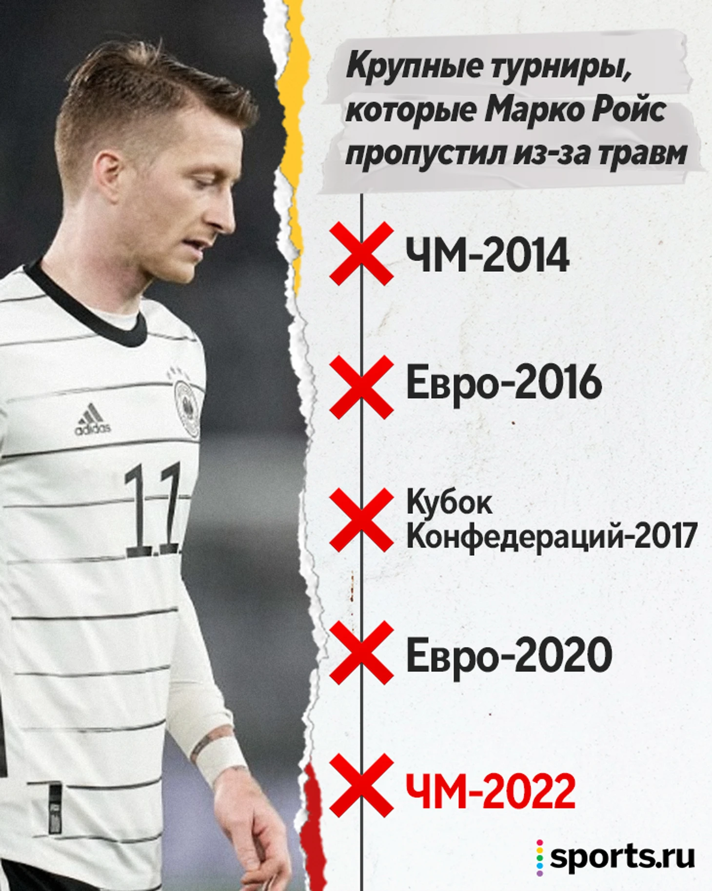 Перед Евро Ройс тоже был лидером сборной, но вновь пропустил крупный турнир – помешало повреждение, полученное в финале Кубка Германии («Боруссия» еще и проиграла «Баварии» с Робертом Левандовским в составе). Вы наверняка помните то самое грустное фото.