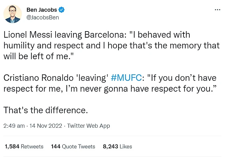 Журналист Бен Якобс сравнил слова Роналду с прощальной пресс-конференцией Лео Месси в «Барселоне».