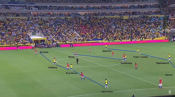 Другая важная стилистическая деталь, определяющая рисунок бразильской сборной – стремление к контролю мяча, но отказ от высокого владения. Тите побаивается автобусов, а потому избегает длительного перепаса в атакующей трети. Бразильцы обычно катают мяч в средней линии, выманивая чужую полузащиту, а после достигают ворот в несколько передач. Навесы не приветствуются (в этом серьезное отличие от прежней Бразилии, которая была одним из лидеров ЧМ-2018 по количеству кроссов).