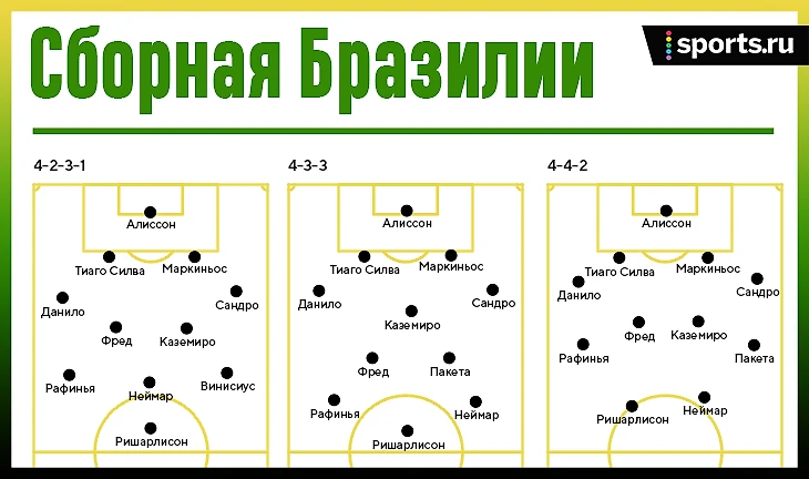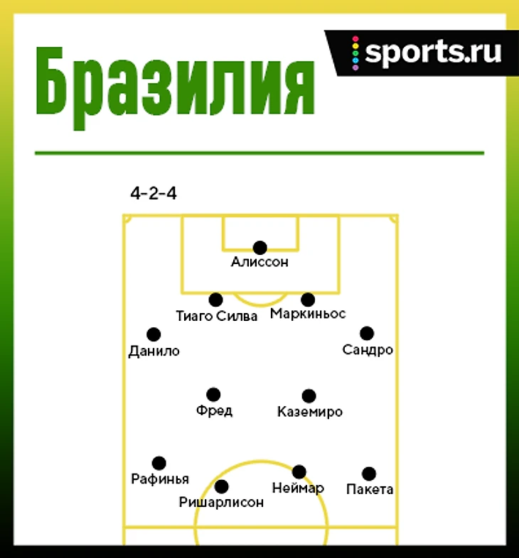 Тите использовал их приблизительно поровну, но по некоторым инсайдам, чемпионат мира начнет с 4-2-3-1. Впрочем, вряд ли это особенно важно. Все эти модули включаются в фазе без мяча. А без мяча бразильцы бывают редко. Во владении команда всегда перестраивается в 4-2-4 – независимо от того, какая схема выбрана базовой.