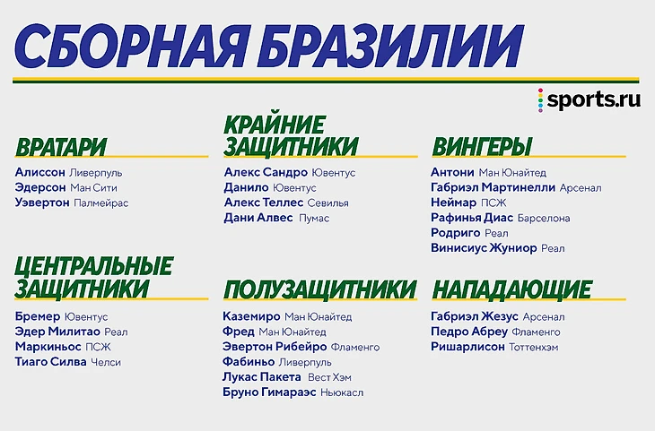 Главный вопрос в атаке – что будет с Винисиусом? Даже стремительный прошлогодний прогресс не сделал его ключевым игроком сборной. В 2022-м он начал с первых минут 5 из 8 матчей, но в большинстве из них отсутствовал травмированный Неймар. А он в этой сборной король. Тите всего раз совместил главных звезд в официальной игре: поставил Нея ложной девяткой в 4-2-3-1 против чилийцев. Инсайдер Диого Дантас утверждает, что на ЧМ ничего не изменится: Винисиус начнет турнир запасным.