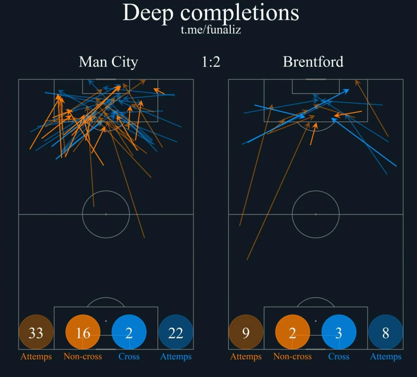 Если смотреть на распределение атак по флангам, то акцент «Сити» на левый край (41,4% касаний) выглядит логичным. Если взглянуть на позиционные метрики, то «Брентфорд» обороняет зону правого центрального защитника хуже, чем зону левого центрального. Хорошие условия для Канселу, в том числе, учитывая, что Занка (Матиас Йоргенсен) играет редко и в этом матче был вынужден подменять Айера.