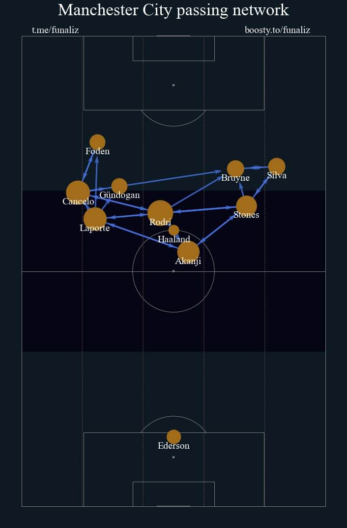 Впрочем, как мы уже отмечали выше, в позиционных атаках этот фактор особых дивидендов не принес. Мы не говорим, что у «Манчестер Сити» совсем не было моментов — были, но в других фазах. Два характерных эпизода из второго тайма: «Сити» удалось выманить соперника в прессинг, затем команда Гвардиолы успешно проходила давление и, таким образом, организовывала атаку на скорости. В одном случае предпоследняя передача прошла не без позиционной ошибки Бена Ми, но всё завершилось опасным ударом Гюндогана. Во второй ситуации Альварес выкатывал на Холланда, но передача не прошла, и удара в итоге не случилось. Интересно, что за весь матч упомянутый выше Холланд нанес всего один удар по воротам, и тот был заблокирован. В определенной степени этот матч иллюстрирует концепцию, согласно которой, в лице Холланда «Сити» получил шикарную опцию в завершении, но в то же время и стал более предсказуемым. Все понимают, кто представляет наибольшую угрозу, например, при кроссах, на кого надо обратить внимание при опеке в первую очередь. Кроме того, «Брентфорд» хорошо подготовился к рывкам полузащитников в штрафную. При этом интеграция Эрлинга в команду продолжается, и неслучайно Гвардиола даже во время супер-результативных отрезков норвежца говорил о том, что тот еще не в форме. Малая вовлеченность в завершение наряду с продолжающимся трендом на задействование Холланда в развитии атак подарили уникальную картину в виде карты передач: из полевых ниже Эрлинга только Аканджи.