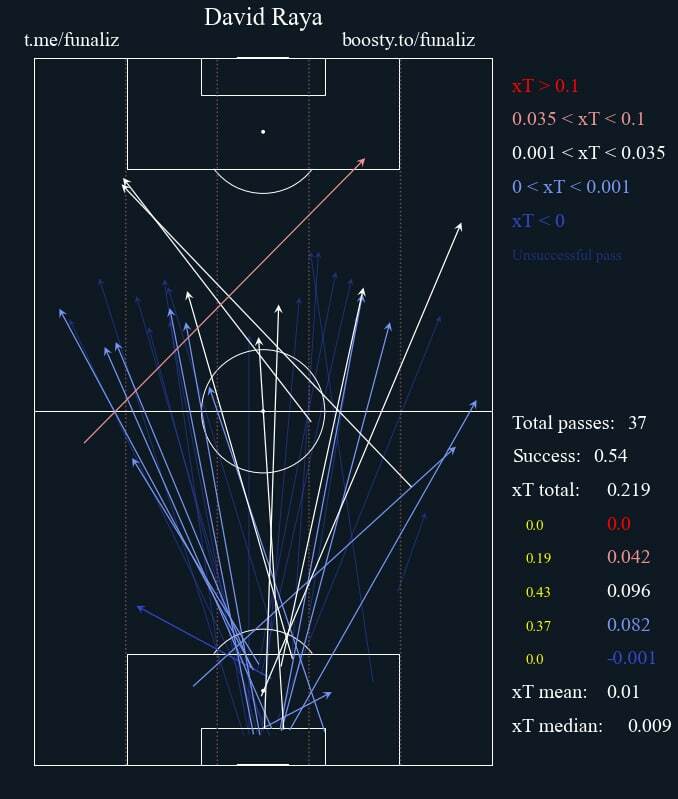 Идея логичная, учитывая: а) выдающуюся игру Давида ногами; б) хороший «верх» Тони; в) понимание того, что у «Сити» возникали проблемы при приеме таких передач. Айван в итоге не был великолепен (по своим меркам) на втором этаже, выиграв семь из 15 дуэлей. Впрочем, удачных ситуаций, когда удавалось зацепиться за мяч после таких передач от Райи, хватило для создания достаточного количества острых ситуаций у ворот «Сити». Самый очевидный пример — гол Тони в начале игры: Райя выполнил стандарт, Ми скинул мяч, после чего Айван отправил его в ворота. Кроме того, был еще один эпизод с рывком левого фулбека Генри, который завершился прострелом, мяч едва не дошел до Тони. Кроме того, в концовке матча (до гола) у Тони возник очередной момент после длинной передачи от Райи. Несмотря на дубль Тони, Райя вполне может претендовать на звание игрока матча: почти все атаки «Брентфорда» начинались с его передач, да и на стандартах он получил нетривиальную роль. Не всех восхитит его точность передач с игры (54%), однако стоит понимать, что качество паса зависит и от исхода единоборства в финальной точке. Если говорить об однозначно неточных передачах, то таких моментов было крайне мало. В итоге испанский кипер стал самым пасующим игроком своей команды: 37 передач с игры. По xT от отданных пасов он вошел в топ-5 в составах обеих команд. Проблематично вспомнить что-либо похожее в плане игры вратаря ногами во время одного матча за последние сезоны. Райя выдал отличный перфоманс в ответ на все вопросы, почему он едет на Чемпионат Мира, а не Давид Де Хеа. Важно, что Райя — современный голкипер, который классно играет ногами и регулярно страхует пространство за спинами защитников (среди голкиперов, совершивших 15 и более подборов в нынешнем сезоне АПЛ, у него самая высокая средняя высота подбора — 20,64 метра).