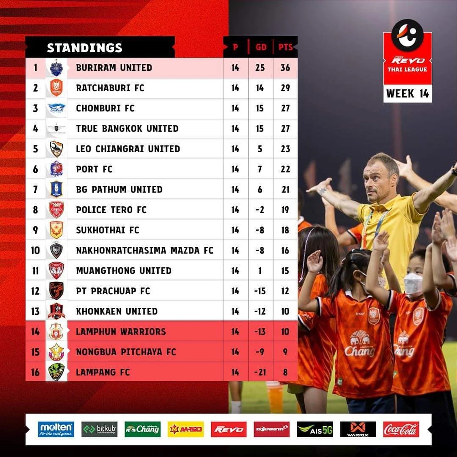 В Т-1 завершился уже 14 тур. В этом туре было две классных вывески: Ратчабури - Патум (3-0) и Порт - Бурирам (1-3). Из неожиданностей: Накхон обыграл Чонбури (1-0), а Прачуап сыграл вничью с Бангкок Юнайтед (1-1). Бурирам пока занимает первое место (36 очков), опережая на 7 очков Ратчабури (29 очков). Третье место занимает Чонбури с 27 очками. Столько же очков у Бангкок Юнайтед, но разница мячей чуть хуже. В Таиланде, напомню, играет 16 команд, так что прошла почти половина чемпионата. И все идет к тому, что Бурирам возьмет очередной трофей.