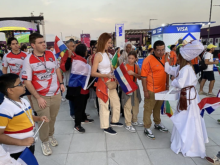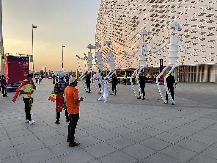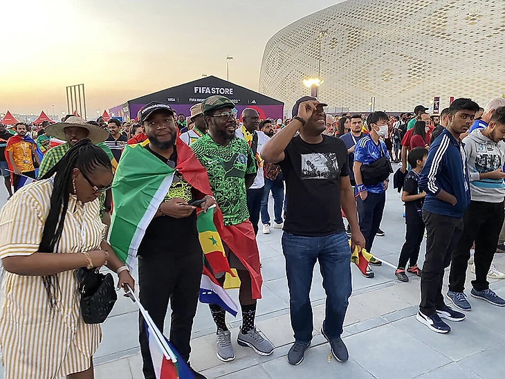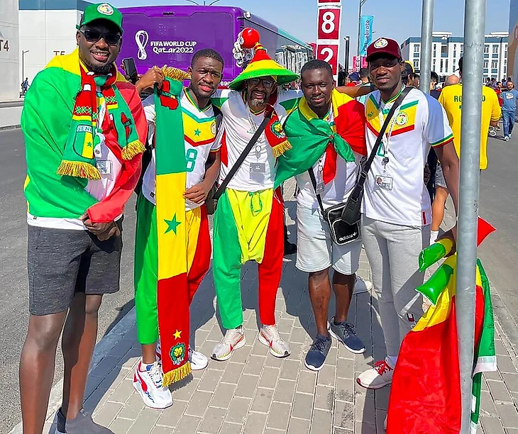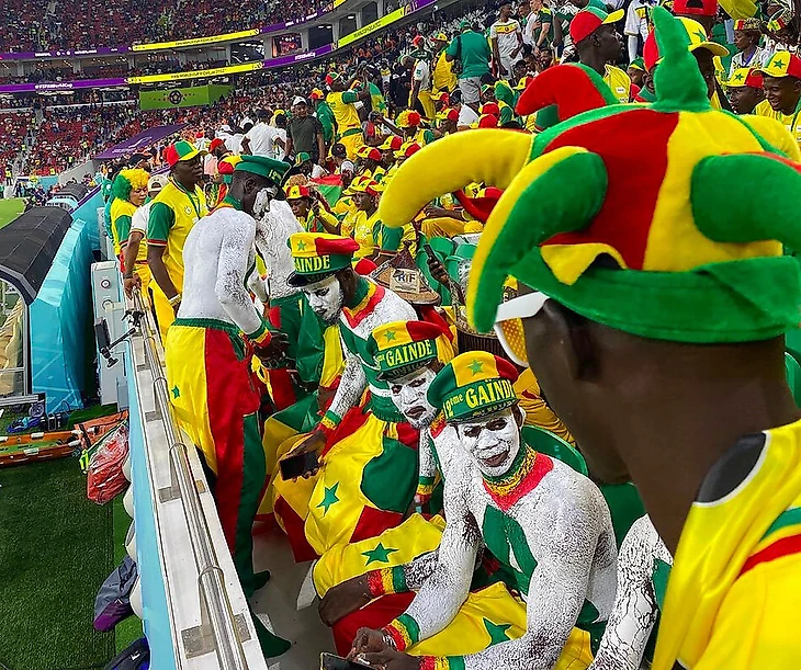 После первого тайма, в котором Сенегал без Мане неплохо справлялся с командой Ван Гала, я подобрался к самому шумному сектору стадиона «Аль-Тумама» и выяснил, что в Доху прилетел даже мэр Дакара Бартелеми Диа.