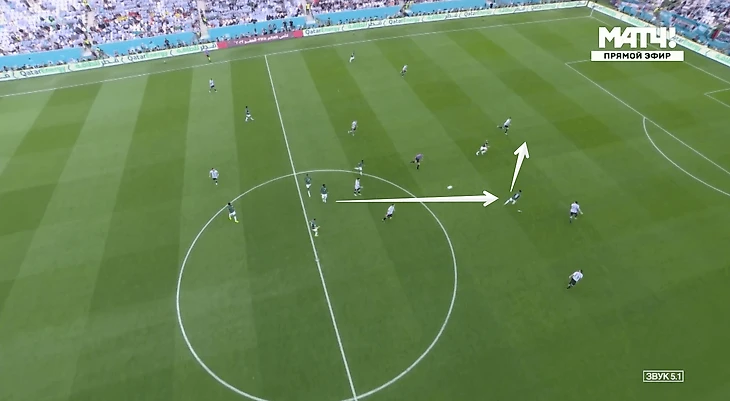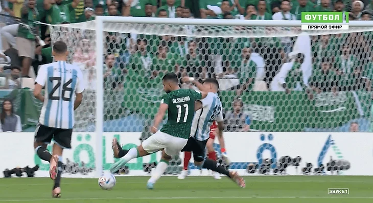 Аль-Брейкан подыграл Салеху Аль-Шехри, а тот чуть не столкнул лбами двух защитников сборной Аргентины. 1:1! Это был первый удар Саудовской Аравии в матче. Счастливейший момент для команды. Но это еще не все.