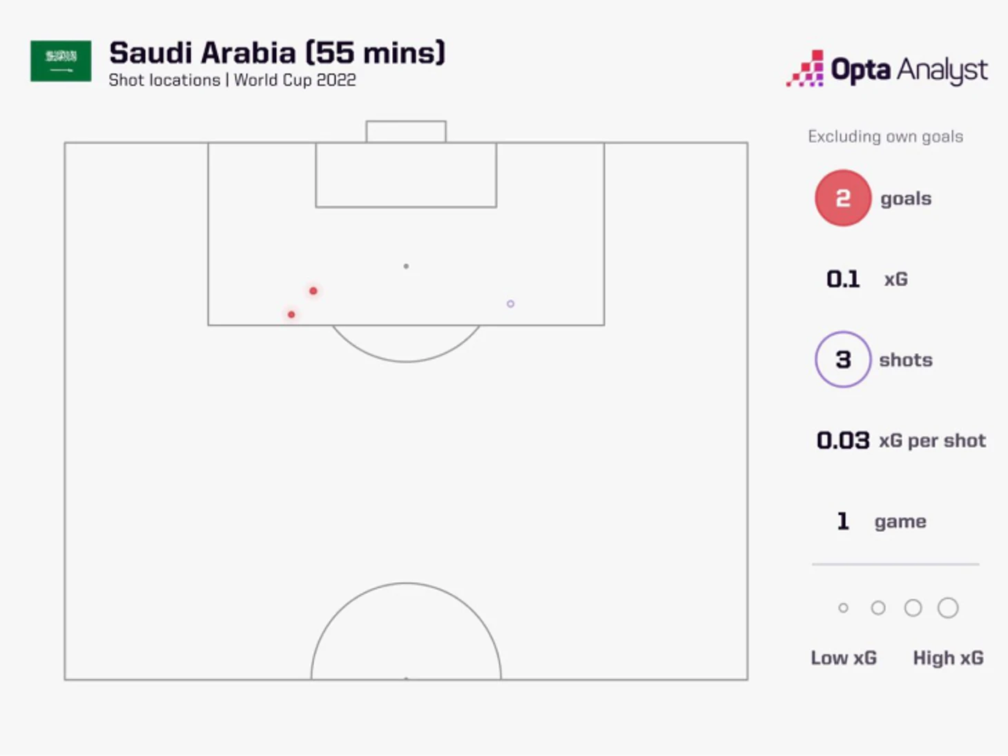 Саудовская Аравия нанесла всего 3 удара по воротам, но забила сразу 2 гола. На картинке – данные про первые 55 минут, но за последние полчаса других ударов не было.