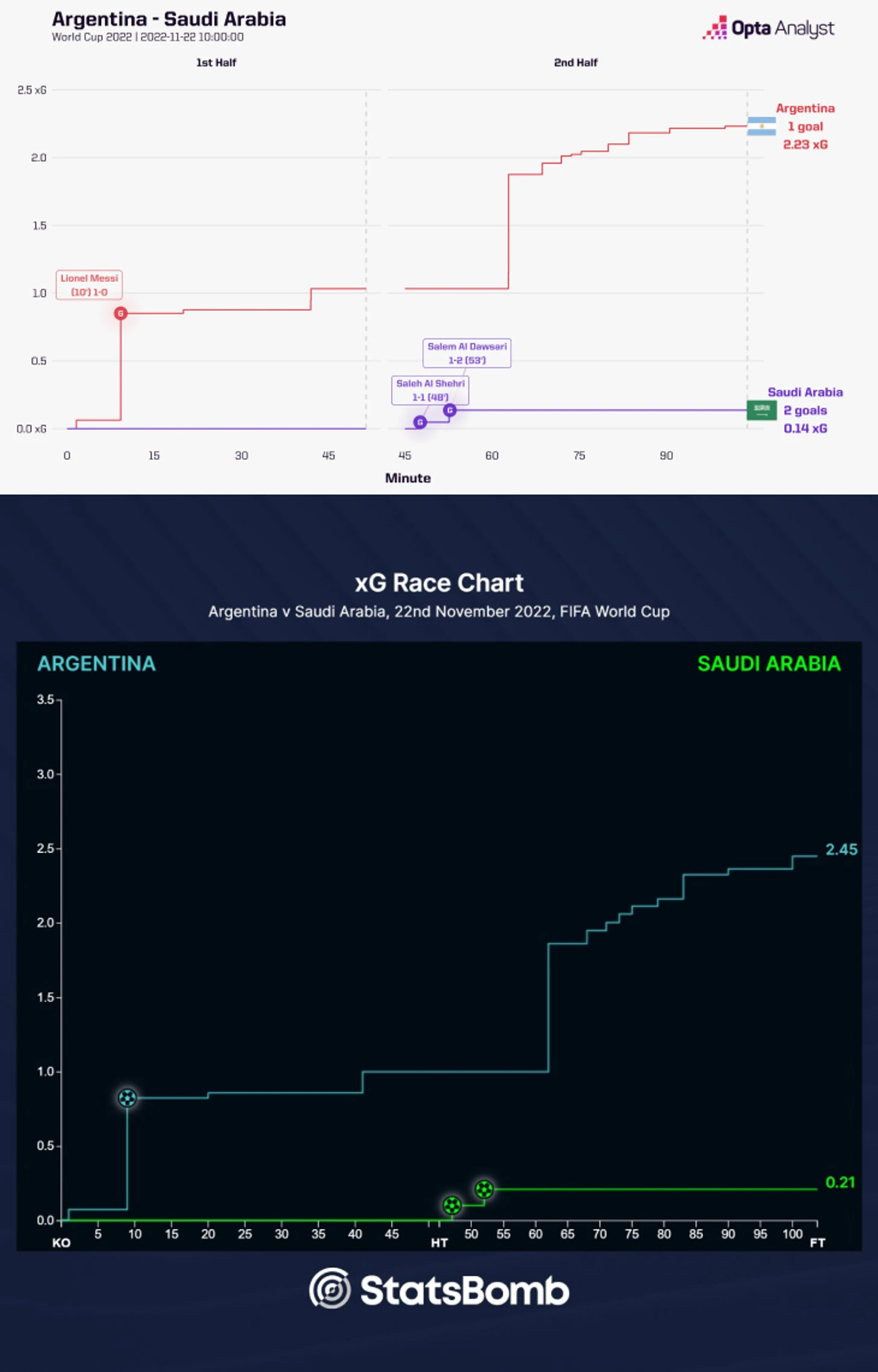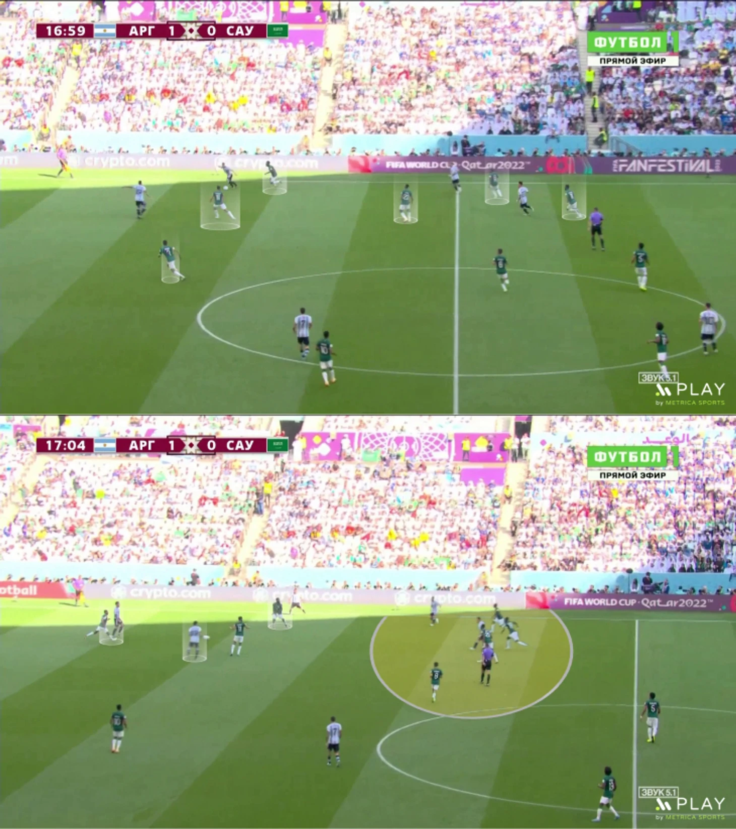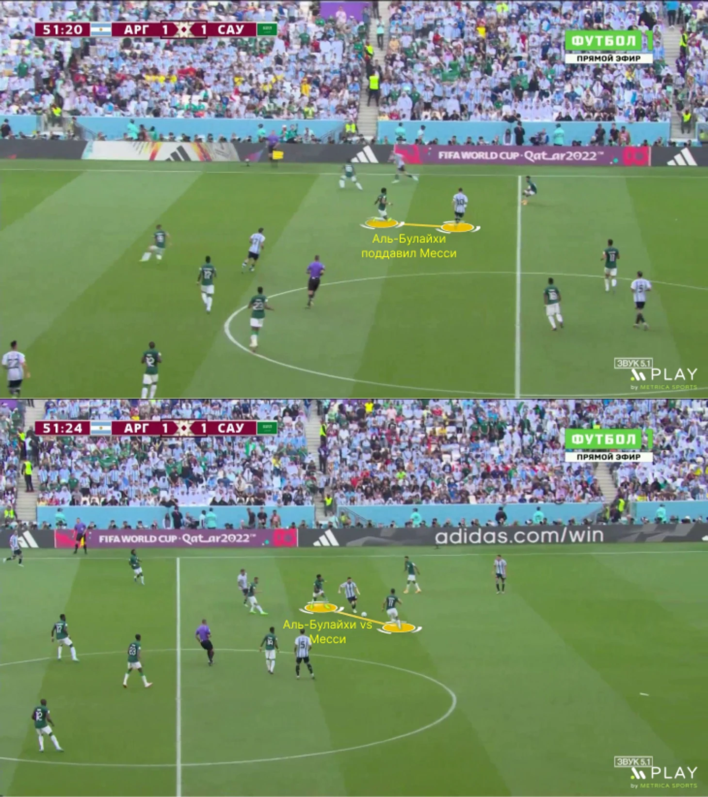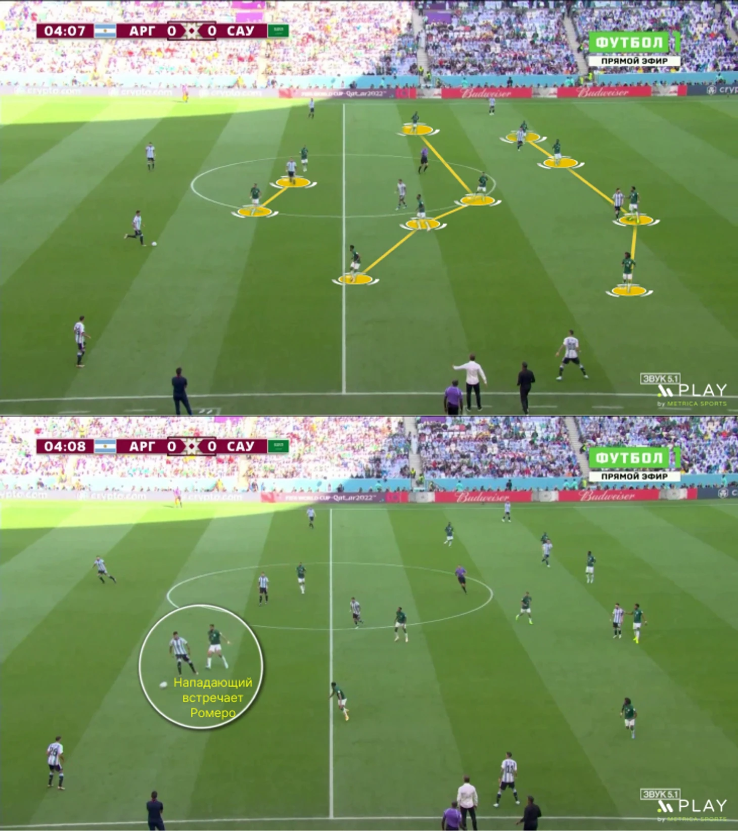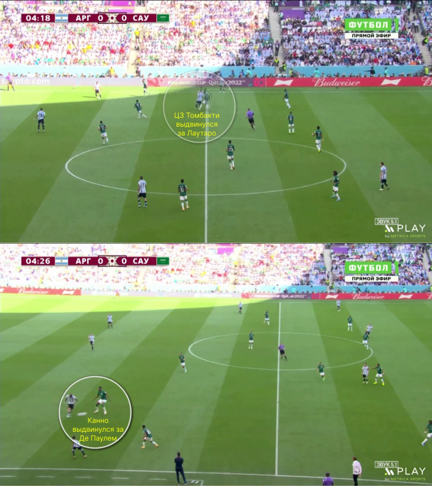 Саудовская Аравия готовилась к высокой линии – порой смелость и неординарность отбрасывали к офсайдным ловушкам Нидерландов на ЧМ-1974. Защитники играли максимально высоко, а расположение между линиями было максимально компактным. Аргентина могла контролировать мяч на своей трети или даже в середине поля, но любая попытка передачи на фланг или за спину в центр пресекалась прессингом.